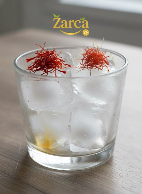 چند تکه یخ را درون لیوان بگذارید و ۳-۴ تار زعفران را روی یخها قرار دهید سپس صبر کنید یخها آب شوند (حدود ۳۰-۴۰ دقیقه).